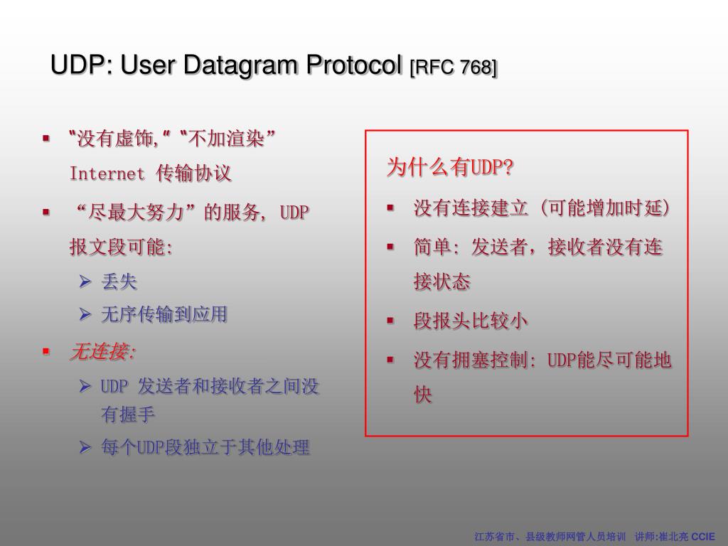“没有虚饰,”“不加渲染”Internet 传输协议 “尽最大努力”的服务, UDP 报文段可能: 丢失 无序传输到应用 无连接: UDP 发送者和接收者之间没有握手 每个UDP段独立于其他处理 为什么有UDP? 没有连接建立 (可能增加时延) 简单: 发送者,接收者没有连接状态 段报头比较小 没有拥塞控制: UDP能尽可能地快 UDP: User Datagram Protocol [RFC 768]