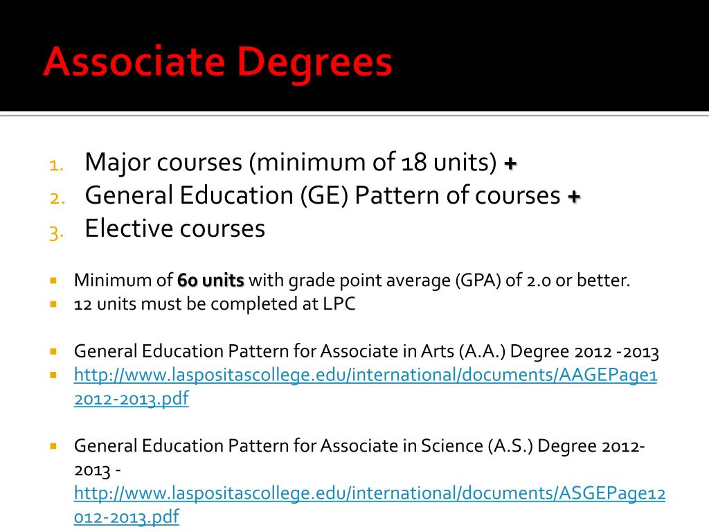 Associate Degrees • Major courses (minimum of 18 units) + • General Education (GE) Pattern of courses+ • Elective courses • Minimum of 60 units with grade point average (GPA) of 2.0 or better. • 12 units must be completed at LPC • General Education Pattern for Associate in Arts (A.A.) Degree 2012 -2013 • http://www.laspositascollege.edu/international/documents/AAGEPage12012-2013.pdf • General Education Pattern for Associate in Science (A.S.) Degree 2012-2013 - http://www.laspositascollege.edu/international/documents/ASGEPage12012-2013.pdf