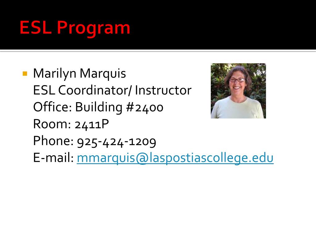 ESL Program • Marilyn Marquis ESL Coordinator/ Instructor Office: Building #2400 Room: 2411P Phone: 925-424-1209 E-mail: mmarquis@laspostiascollege.edu