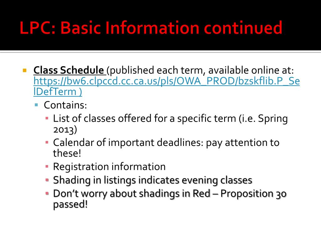 LPC: Basic Information continued • Class Schedule (published each term, available online at: https://bw6.clpccd.cc.ca.us/pls/OWA_PROD/bzskflib.P_SelDefTerm ) • Contains: • List of classes offered for a specific term (i.e. Spring 2013) • Calendar of important deadlines: pay attention to these! • Registration information • Shading in listings indicates evening classes • Don’t worry about shadings in Red – Proposition 30 passed!