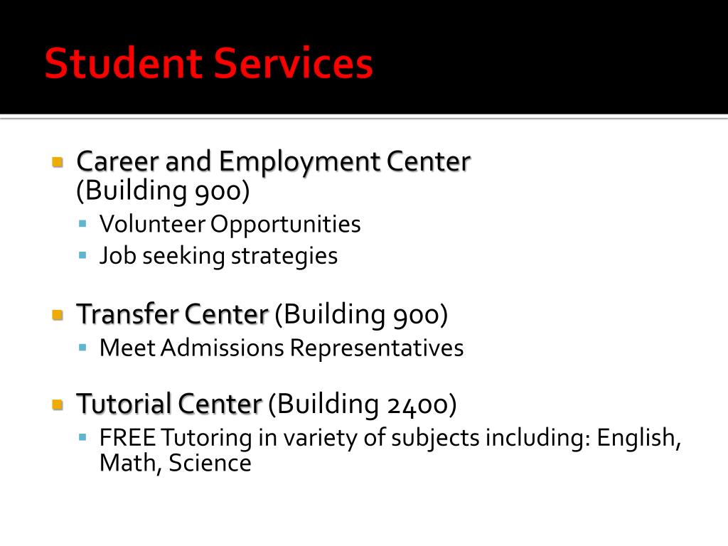 Student Services • Career and Employment Center (Building 900) • Volunteer Opportunities • Job seeking strategies • Transfer Center (Building 900) • Meet Admissions Representatives • Tutorial Center (Building 2400) • FREE Tutoring in variety of subjects including: English, Math, Science
