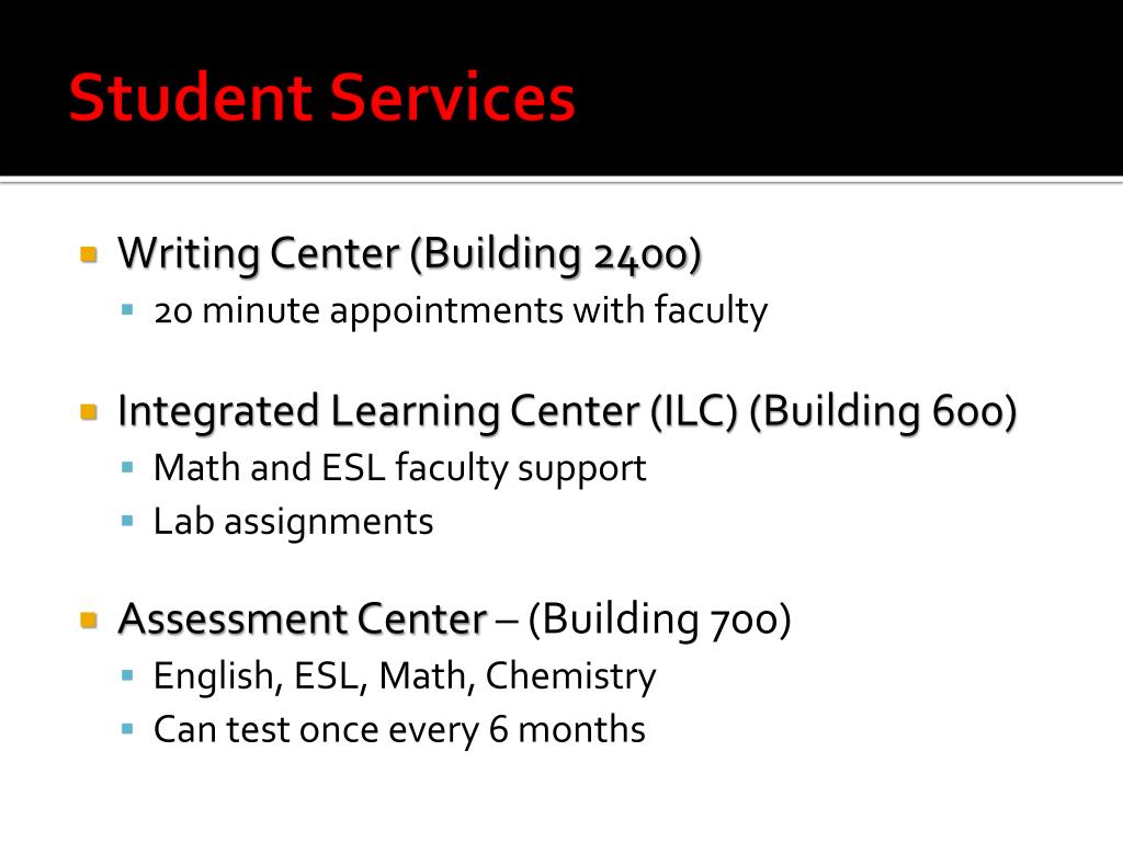 Student Services • Writing Center (Building 2400) • 20 minute appointments with faculty • Integrated Learning Center (ILC) (Building 600) • Math and ESL faculty support • Lab assignments • Assessment Center – (Building 700) • English, ESL, Math, Chemistry • Can test once every 6 months