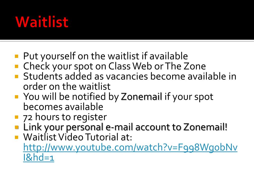 Waitlist • Put yourself on the waitlist if available • Check your spot on Class Web or The Zone • Students added as vacancies become available in order on the waitlist • You will be notified by Zonemail if your spot becomes available • 72 hours to register • Link your personal e-mail account to Zonemail! • Waitlist Video Tutorial at: http://www.youtube.com/watch?v=F998Wg0bNvI&hd=1