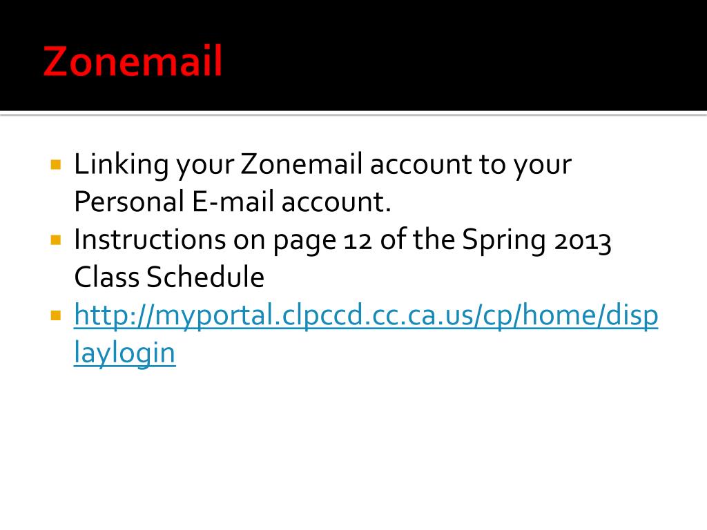 Zonemail • Linking your Zonemail account to your Personal E-mail account. • Instructions on page 12 of the Spring 2013 Class Schedule • http://myportal.clpccd.cc.ca.us/cp/home/displaylogin