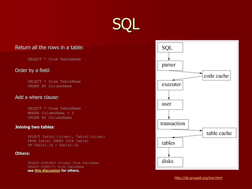 SQL Return all the rows in a table: SELECT * from TableName Order by a field: SELECT * from TableName ORDER BY ColumnName Add a where clause: SELECT * from TableName WHERE ColumnName < 5 ORDER BY ColumnName Joining two tables: SELECT Table1.Column1, Table2.Column1 FROM Table1 INNER JOIN Table2 ON Table1.Id = Table2.Id Others: SELECT DISTINCT Column1 from TableName SELECT COUNT(*) from TableName see this discussion for others. http://db.grussell.org/imp.html