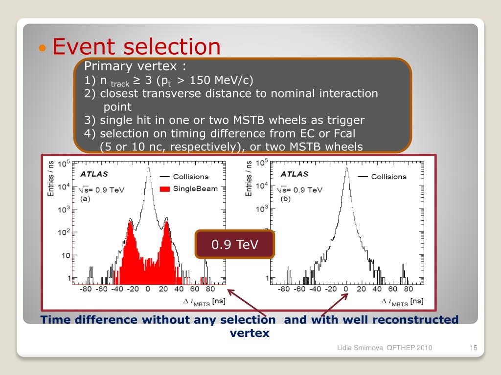 Event selection Primary vertex : 1) n track ≥ 3 (pt > 150 MeV/c) 2) closest transverse distance to nominal interaction point 3) single hit in one or two MSTB wheels as trigger 4) selection on timing difference from EC or Fcal (5 or 10 nc, respectively), or two MSTB wheels 0.9 TeV Time difference without any selection and with well reconstructed vertex Lidia Smirnova QFTHEP 2010