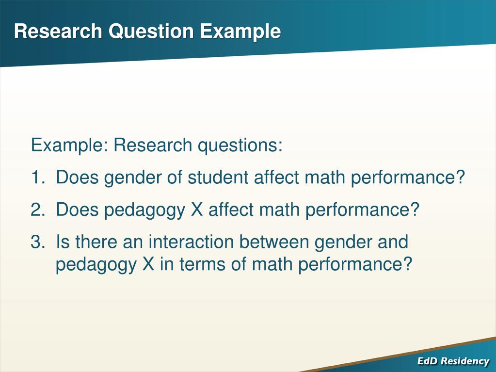 Research Question Example Example: Research questions: • Does gender of student affect math performance? • Does pedagogy X affect math performance? • Is there an interaction between gender and pedagogy X in terms of math performance?