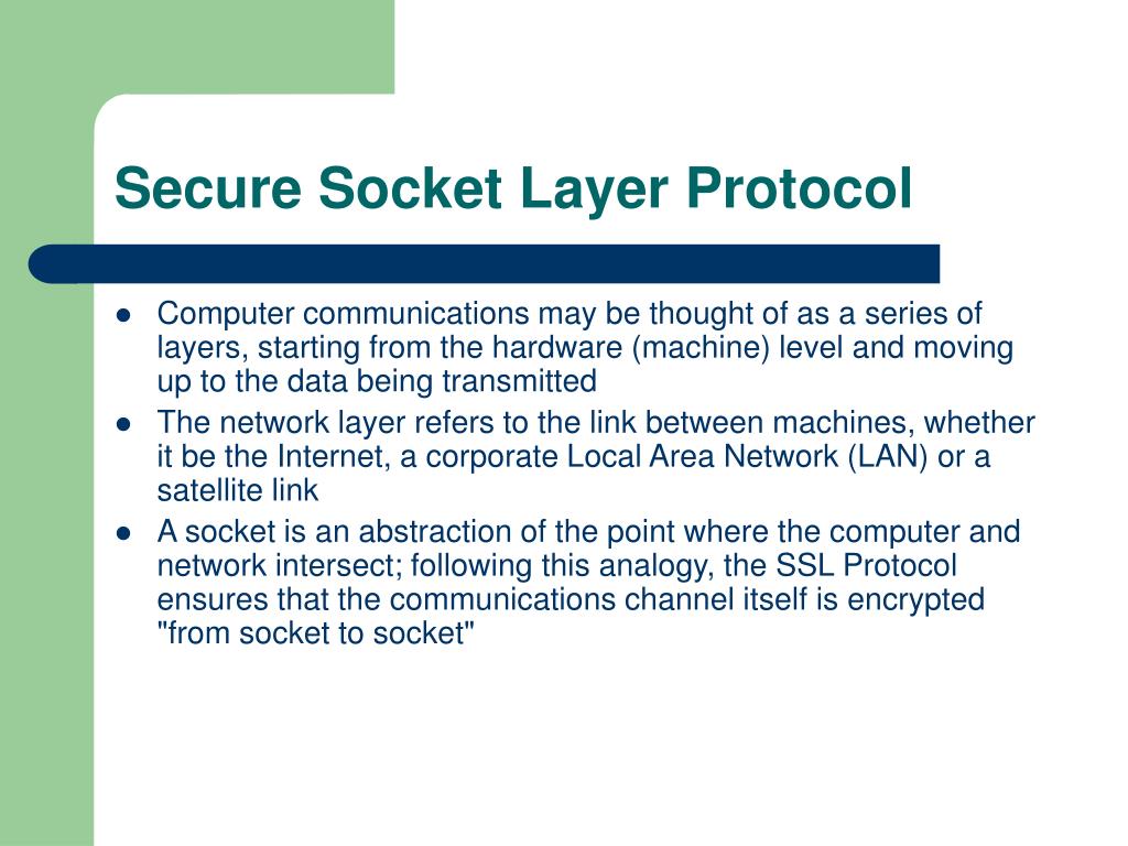 Secure Socket Layer Protocol • Computer communications may be thought of as a series of layers, starting from the hardware (machine) level and moving up to the data being transmitted • The network layer refers to the link between machines, whether it be the Internet, a corporate Local Area Network (LAN) or a satellite link • A socket is an abstraction of the point where the computer and network intersect; following this analogy, the SSL Protocol ensures that the communications channel itself is encrypted "from socket to socket"