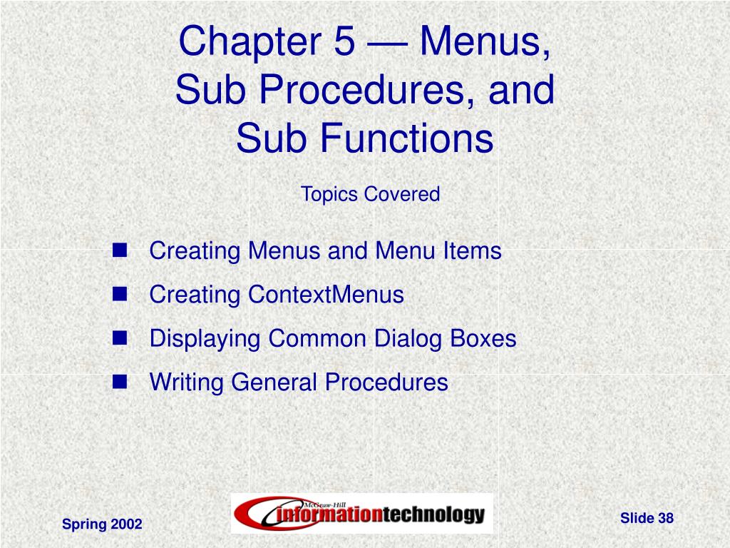 Chapter 5 — Menus, Sub Procedures, and Sub FunctionsTopics Covered • Creating Menus and Menu Items • Creating ContextMenus • Displaying Common Dialog Boxes • Writing General Procedures Spring 2002