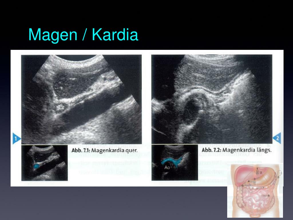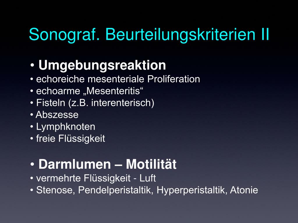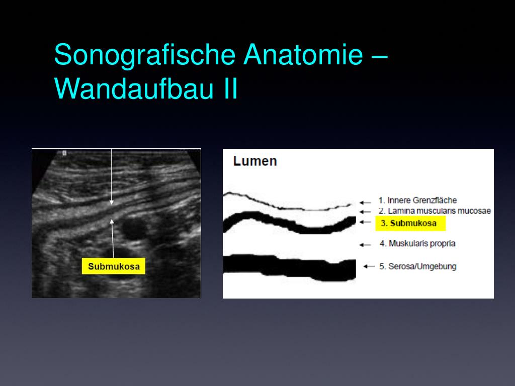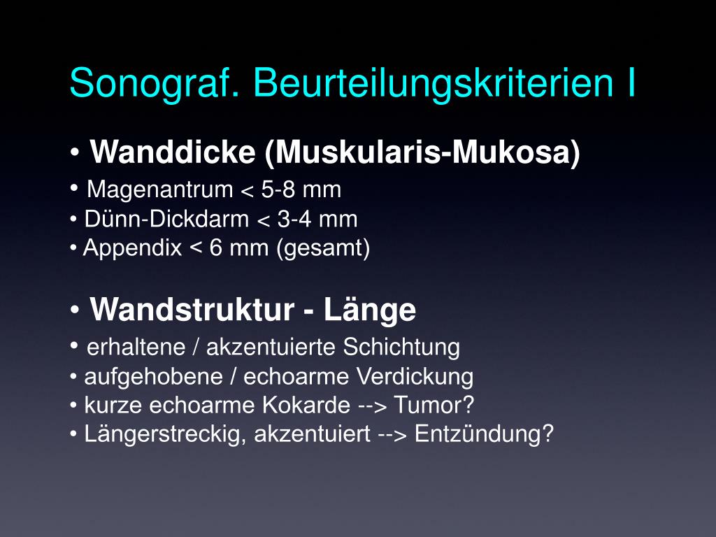 Sonograf. Beurteilungskriterien I • Wanddicke (Muskularis-Mukosa) • Magenantrum < 5-8 mm • Dünn-Dickdarm < 3-4 mm • Appendix < 6 mm (gesamt) • Wandstruktur - Länge • erhaltene / akzentuierte Schichtung • aufgehobene / echoarme Verdickung • kurze echoarme Kokarde --> Tumor? • Längerstreckig, akzentuiert --> Entzündung? • Durchblutung: normal – verstärkt