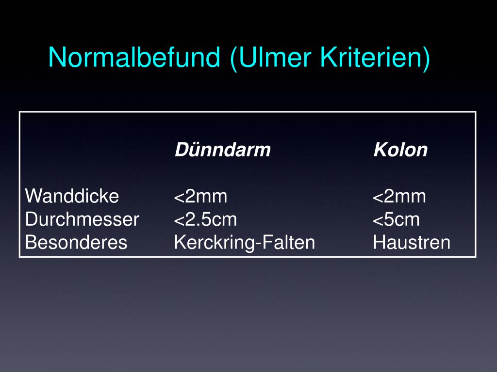 Normalbefund (Ulmer Kriterien) DünndarmKolon Wanddicke <2mm <2mm Durchmesser <2.5cm <5cm Besonderes Kerckring-Falten Haustren