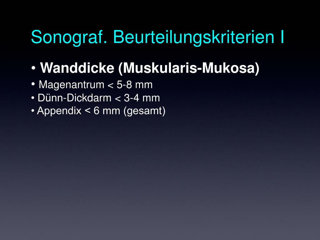 Sonograf. Beurteilungskriterien I • Wanddicke (Muskularis-Mukosa) • Magenantrum < 5-8 mm • Dünn-Dickdarm < 3-4 mm • Appendix < 6 mm (gesamt)