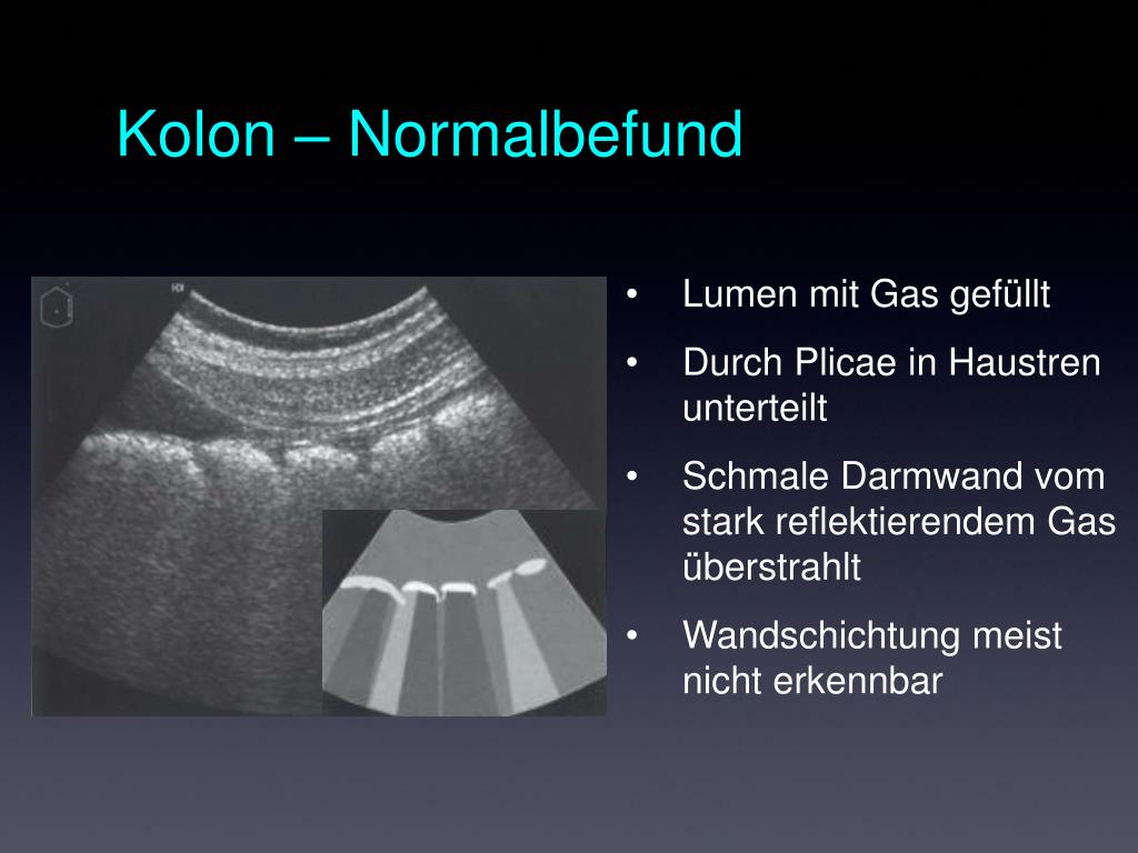 Kolon – Normalbefund • Lumen mit Gas gefüllt • Durch Plicae in Haustren unterteilt • Schmale Darmwand vom stark reflektierendem Gas überstrahlt • Wandschichtung meist nicht erkennbar