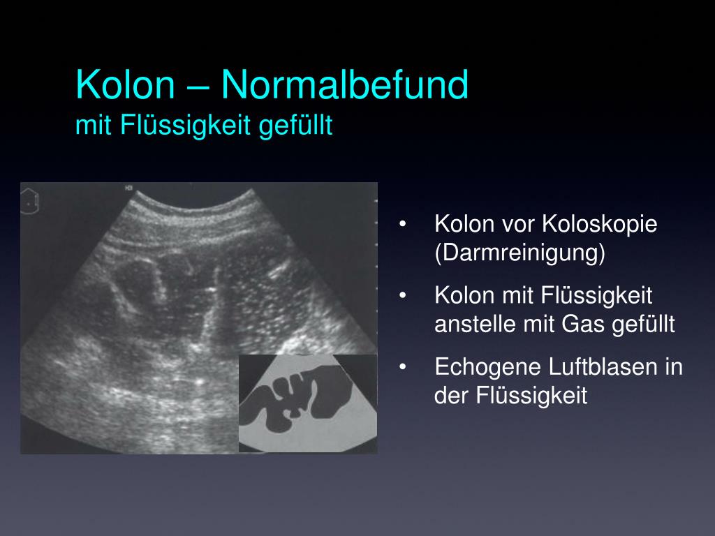 Kolon – Normalbefund mit Flüssigkeit gefüllt • Kolon vor Koloskopie (Darmreinigung) • Kolon mit Flüssigkeit anstelle mit Gas gefüllt • Echogene Luftblasen in der Flüssigkeit