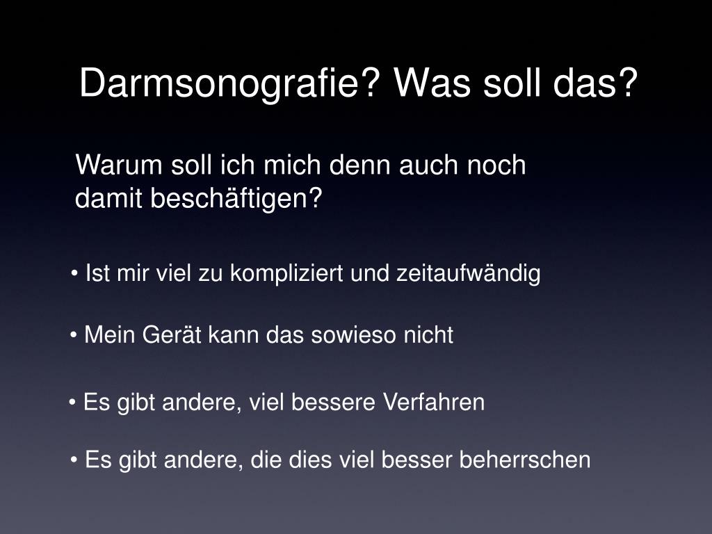 Darmsonografie? Was soll das? Warum soll ich mich denn auch noch damit beschäftigen? • Ist mir viel zu kompliziert und zeitaufwändig • Mein Gerät kann das sowieso nicht • Es gibt andere, viel bessere Verfahren • Es gibt andere, die dies viel besser beherrschen