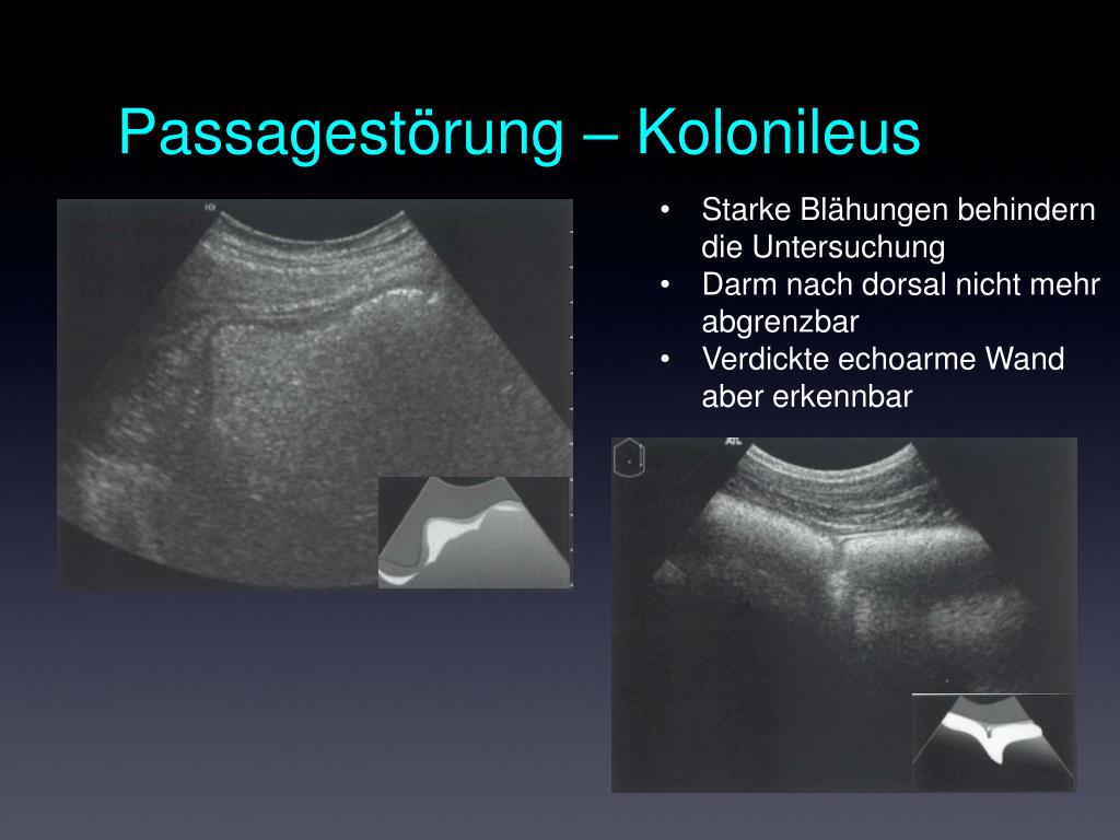 Passagestörung – Kolonileus • Starke Blähungen behindern die Untersuchung • Darm nach dorsal nicht mehr abgrenzbar • Verdickte echoarme Wand aber erkennbar