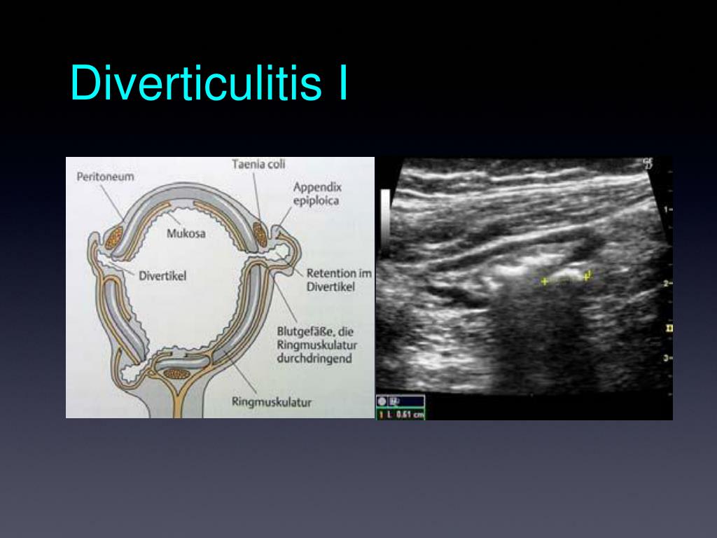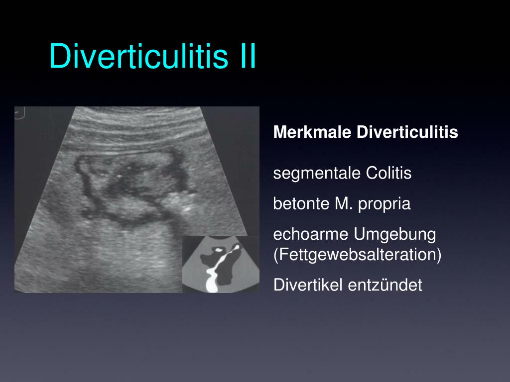 Diverticulitis II Merkmale Diverticulitis segmentale Colitis betonte M. propria echoarme Umgebung(Fettgewebsalteration) Divertikel entzündet