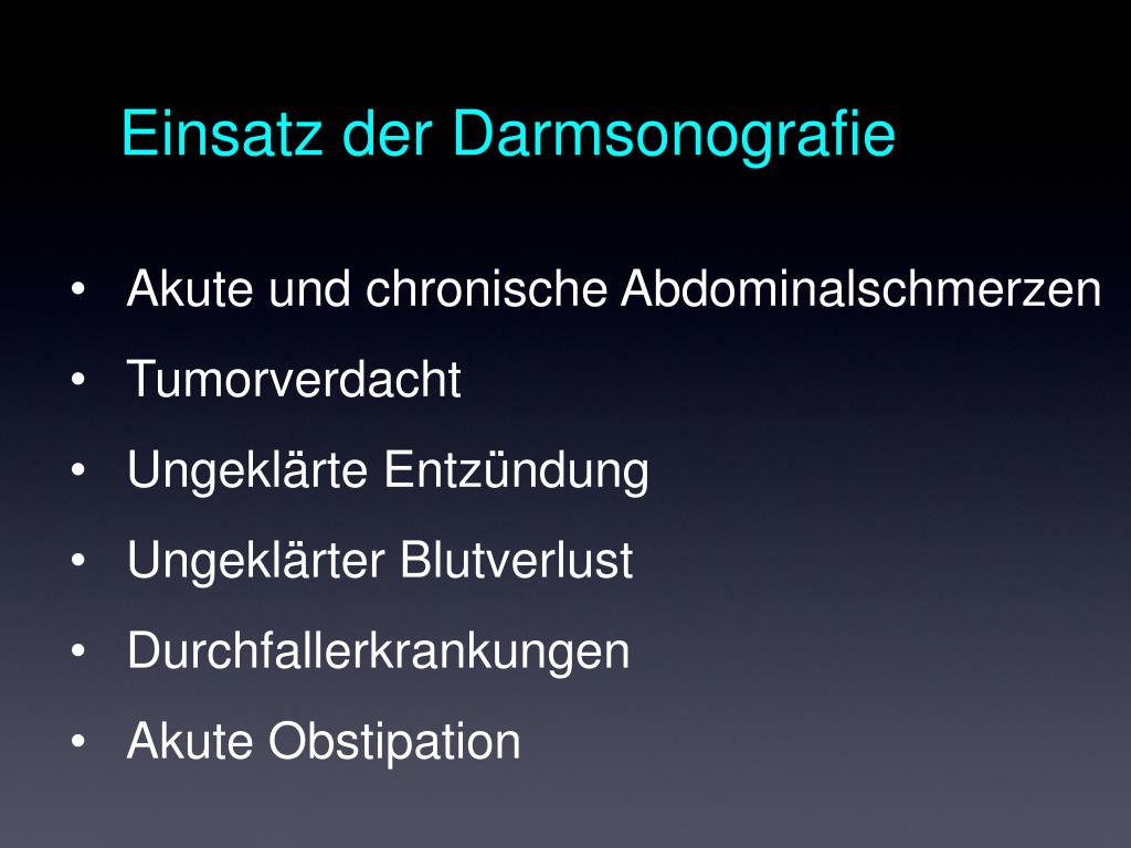 Einsatz der Darmsonografie • Akute und chronische Abdominalschmerzen • Tumorverdacht • Ungeklärte Entzündung • Ungeklärter Blutverlust • Durchfallerkrankungen • Akute Obstipation