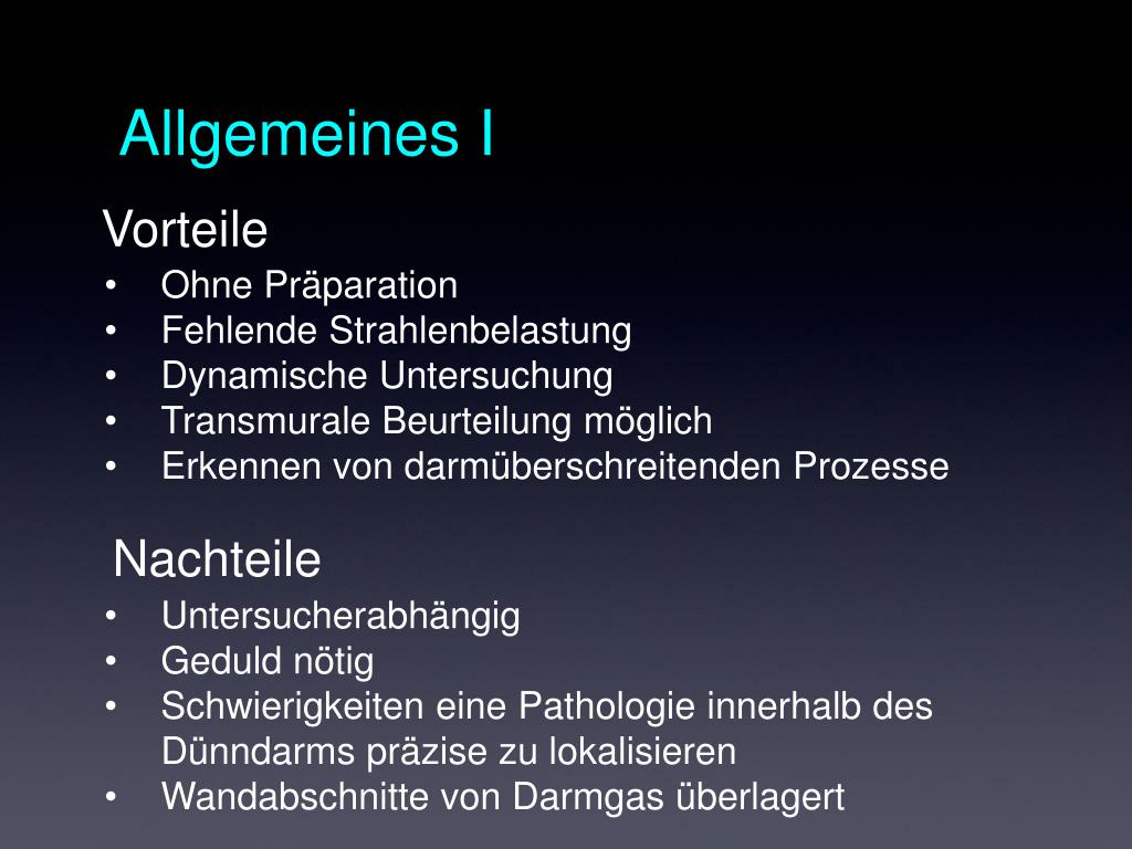 Allgemeines I Vorteile • Ohne Präparation • Fehlende Strahlenbelastung • Dynamische Untersuchung • Transmurale Beurteilung möglich • Erkennen von darmüberschreitenden Prozesse Nachteile • Untersucherabhängig • Geduld nötig • Schwierigkeiten eine Pathologie innerhalb des Dünndarms präzise zu lokalisieren • Wandabschnitte von Darmgas überlagert