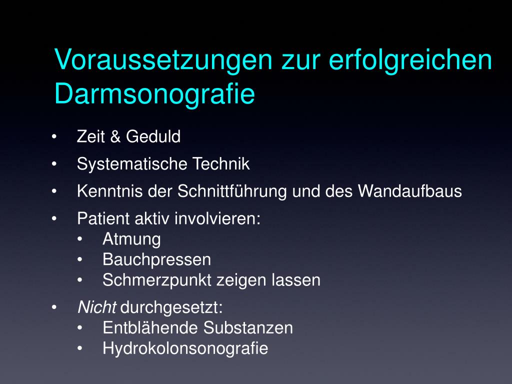 Voraussetzungen zur erfolgreichen Darmsonografie • Zeit & Geduld • Systematische Technik • Kenntnis der Schnittführung und des Wandaufbaus • Patient aktiv involvieren: • Atmung • Bauchpressen • Schmerzpunkt zeigen lassen • Nicht durchgesetzt: • Entblähende Substanzen • Hydrokolonsonografie