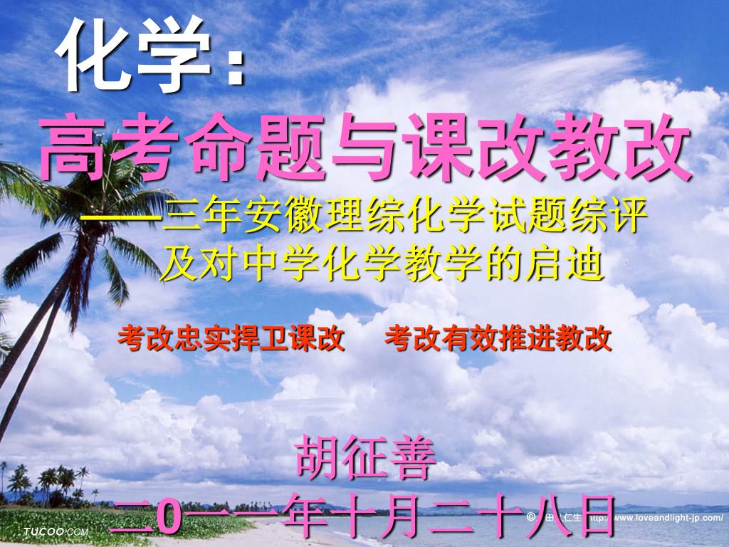 化学: 高考命题与课改教改 ——三年安徽理综化学试题综评 及对中学化学教学的启迪 考改忠实捍卫课改 考改有效推进教改 胡征善 二0一一年十月二十八日