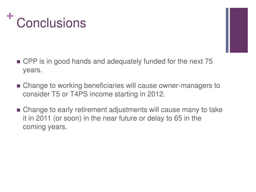 Conclusions • CPP is in good hands and adequately funded for the next 75 years. • Change to working beneficiaries will cause owner-managers to consider T5 or T4PS income starting in 2012. • Change to early retirement adjustments will cause many to take it in 2011 (or soon) in the near future or delay to 65 in the coming years.