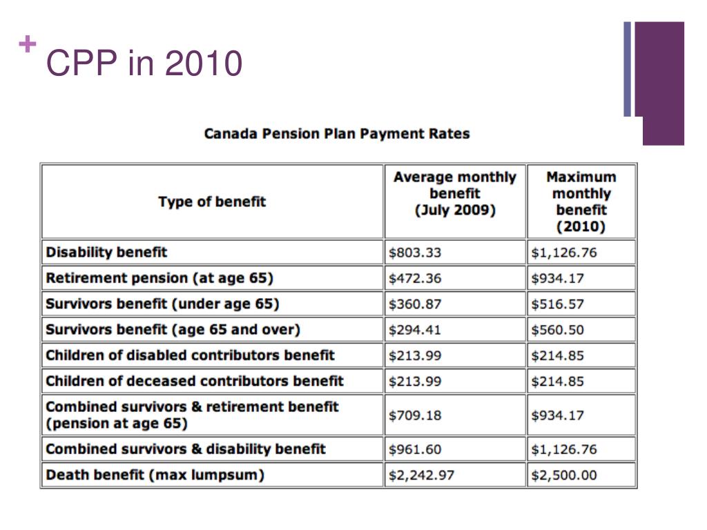 Intent of CPP Retirement Benefits • Replaces 25% or pre-retirement earnings up to a maximum amount called the YMPE ($47,200 in 2010). • This means the max. pension in 2010 will translate to $11,210 ($934.17/mth). • The contribution rate is 9.9% of earnings over $3,500 but under $47,200. The amount is split between employer and employee unless you are self-employed.