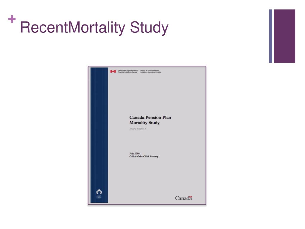Mortality Costs. • In 2005, life expectancy at birth in Canada stood at 78 years for males and 83 years for females. This represents a significant increase in life expectancy since the start of the 20th century (27 years for males and 31 years for females) • In Canada, most of the increase in life expectancy at birth over the last thirty years has come from improvements in mortality at age 65 and over while prior to that time most of the increase in life expectancies at birth came from mortality improvements at ages under 65. Extending lifespan has not happened nor expected in the coming decades. • As a result, over the last 30 years, life expectancy at age 65 has increased from 14 to 18 years for males and from 18 to 21 years for females. More recently, male mortality improvement rates have been greater than for females. • Higher income beneficiaries live longer. • Mortality increases were not a major concern on the last valuation report.