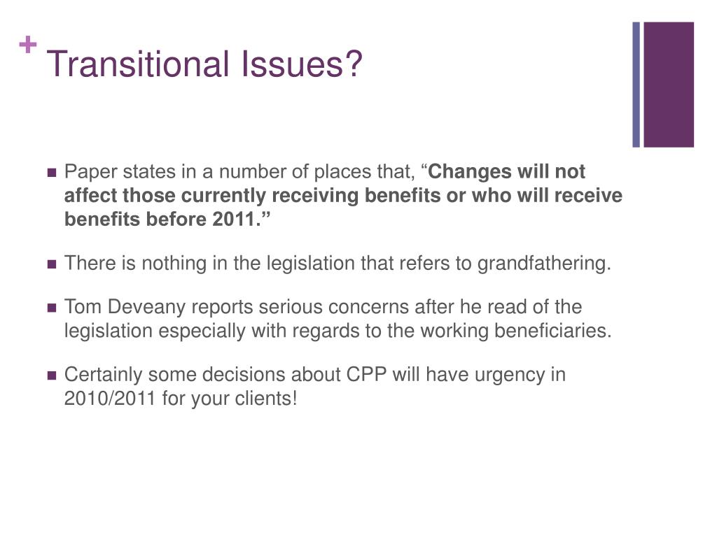 Transitional Issues? • Paper states in a number of places that, “Changes will not affect those currently receiving benefits or who will receive benefits before 2011.” • There is nothing in the legislation that refers to grandfathering. • Tom Deveany reports serious concerns after he read of the legislation especially with regards to the working beneficiaries. • Certainly some decisions about CPP will have urgency in 2010/2011 for your clients!