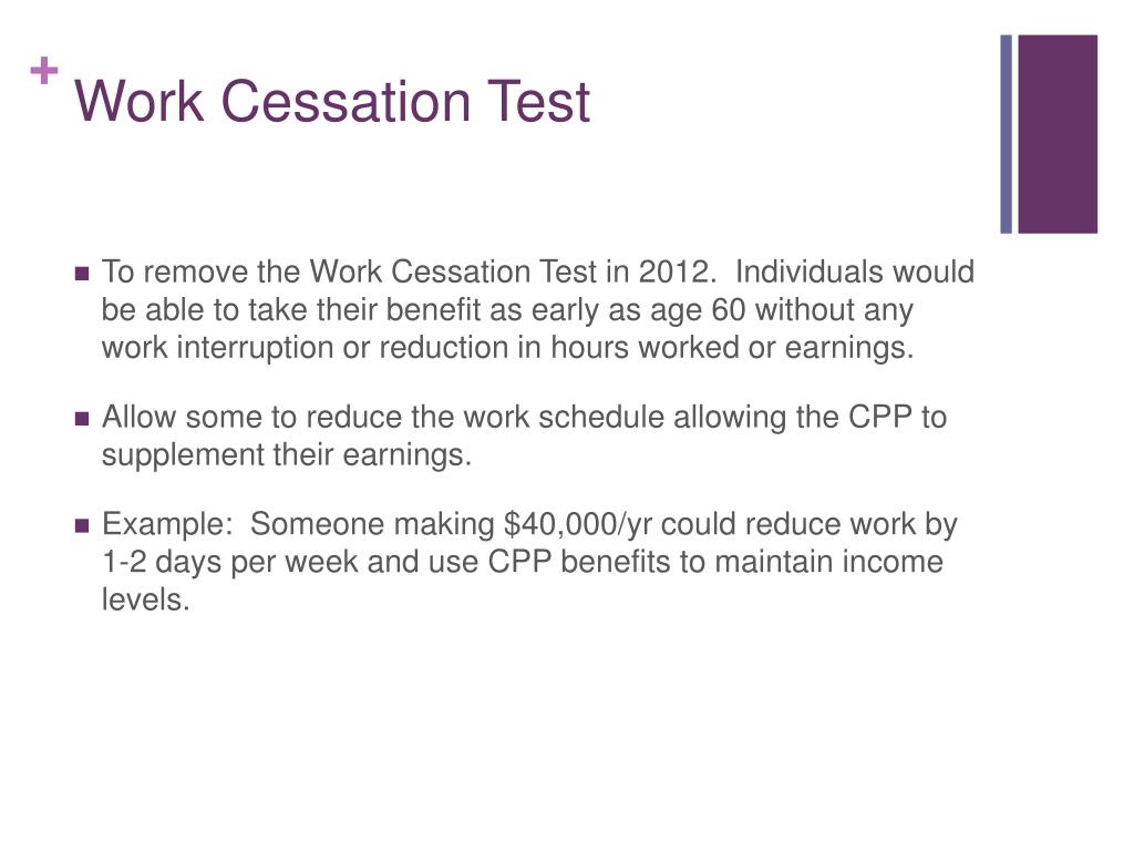 Work Cessation Test • To remove the Work Cessation Test in 2012. Individuals would be able to take their benefit as early as age 60 without any work interruption or reduction in hours worked or earnings. • Allow some to reduce the work schedule allowing the CPP to supplement their earnings. • Example: Someone making $40,000/yr could reduce work by 1-2 days per week and use CPP benefits to maintain income levels.
