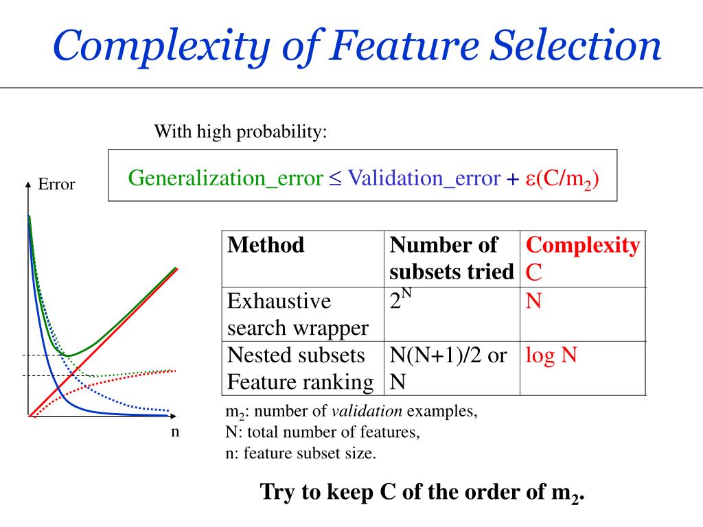 Complexity of Feature Selection With high probability: Generalization_errorValidation_error + e(C/m2) Error m2: number of validation examples, N: total number of features, n: feature subset size. n Try to keep C of the order of m2.