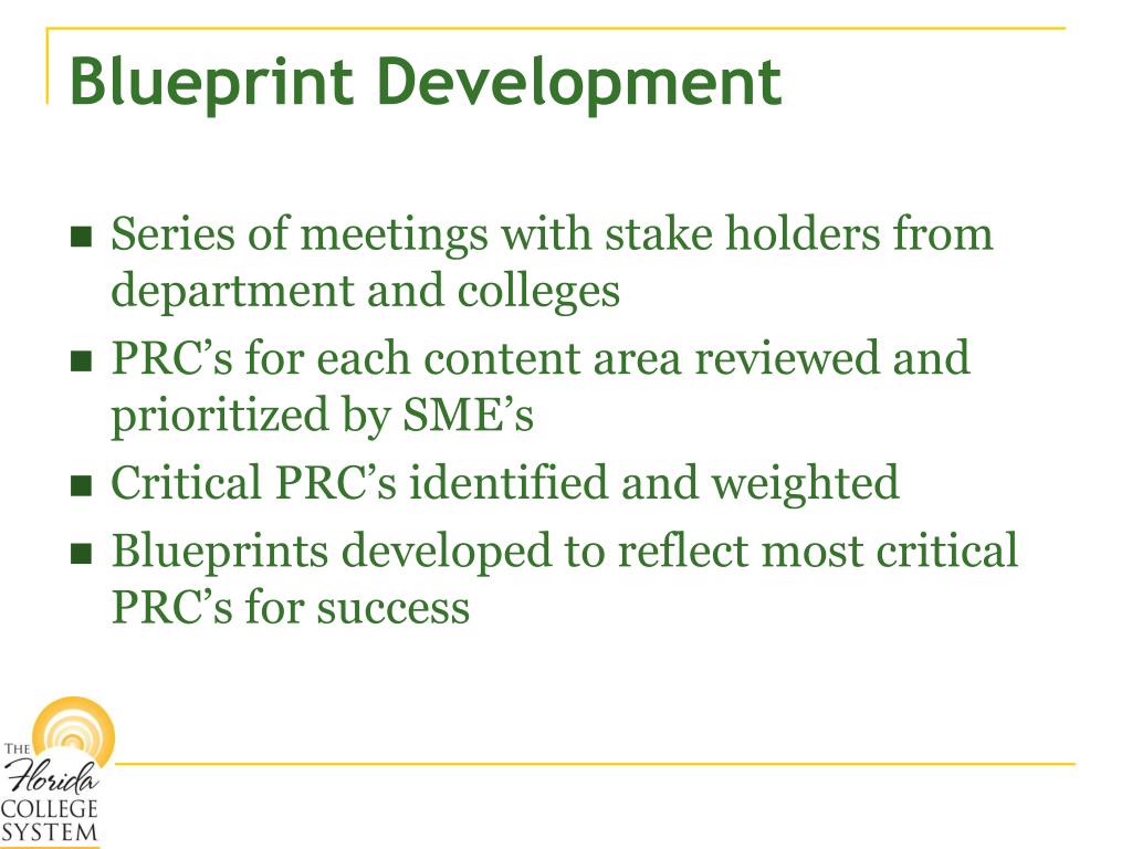 Blueprint Development • Series of meetings with stake holders from department and colleges • PRC’s for each content area reviewed and prioritized by SME’s • Critical PRC’s identified and weighted • Blueprints developed to reflect most critical PRC’s for success