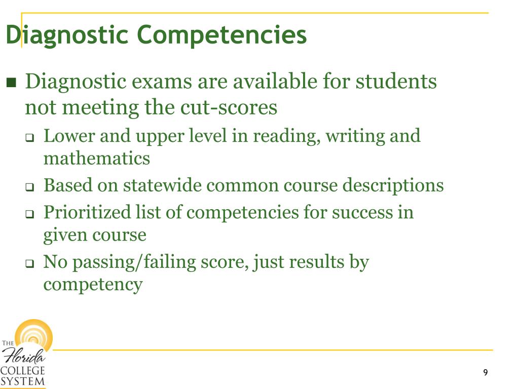 Diagnostic Competencies Diagnostic exams are available for students not meeting the cut-scores Lower and upper level in reading, writing and mathematics Based on statewide common course descriptions Prioritized list of competencies for success in given course No passing/failing score, just results by competency 9