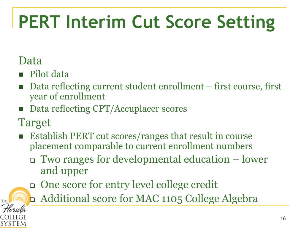 PERT Interim Cut Score Setting Data • Pilot data • Data reflecting current student enrollment – first course, first year of enrollment • Data reflecting CPT/Accuplacer scores Target • Establish PERT cut scores/ranges that result in course placement comparable to current enrollment numbers • Two ranges for developmental education – lower and upper • One score for entry level college credit • Additional score for MAC 1105 College Algebra 16