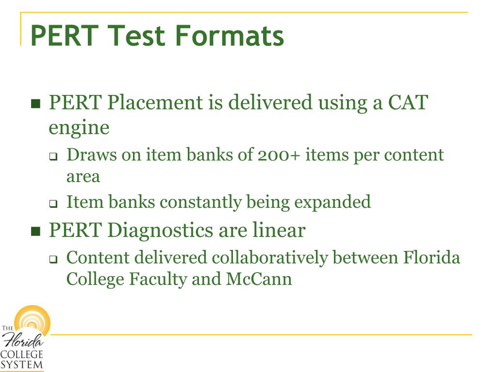 PERT Test Formats • PERT Placement is delivered using a CAT engine • Draws on item banks of 200+ items per content area • Item banks constantly being expanded • PERT Diagnostics are linear • Content delivered collaboratively between Florida College Faculty and McCann