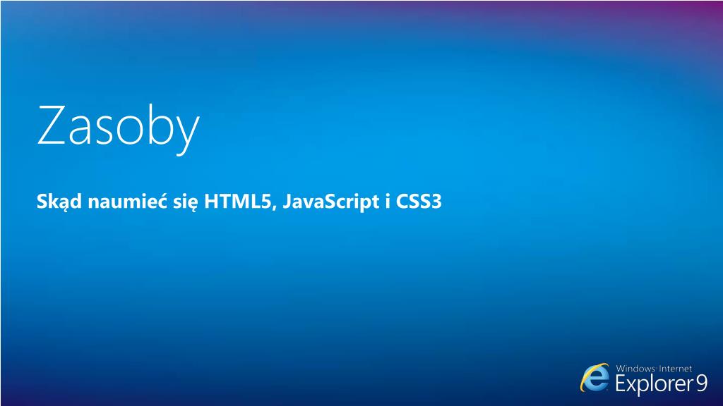 Podejście Microsoft do HTML5 IE9 IE Platform Previews HTML5 Labs Gotowe witrynyHTML5 Standardy „work in progress” Wschodzącestandardy beautyoftheweb.com ietestdrive.com html5labs.com