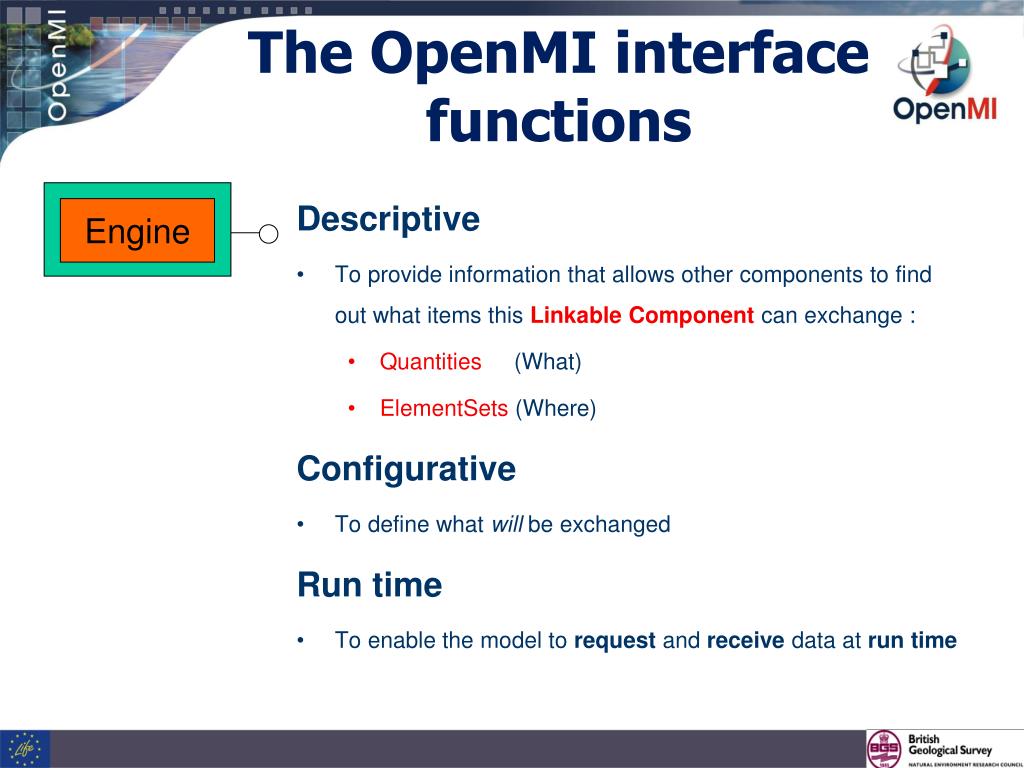 The OpenMI interface functions Descriptive • To provide informationthatallows other componentsto find out what items this Linkable Component can exchange : • Quantities (What) • ElementSets (Where) Configurative • To define what will be exchanged Run time • Toenable the model to request and receive dataat run time Engine
