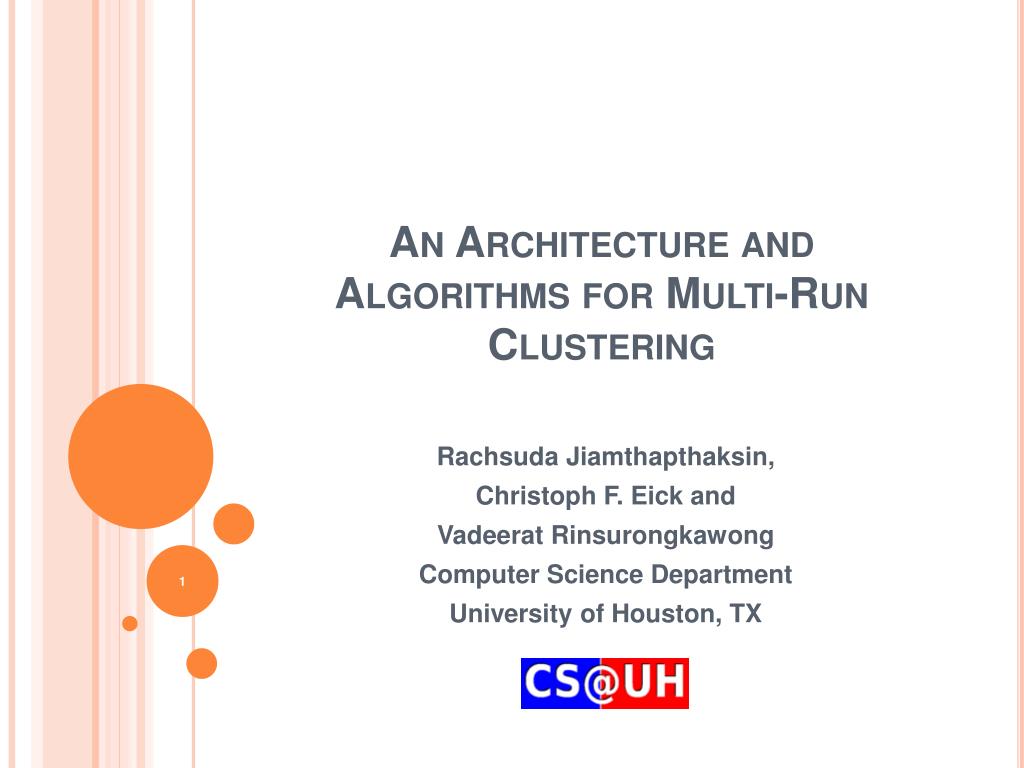 An Architecture and Algorithms for Multi-Run Clustering Rachsuda Jiamthapthaksin, Christoph F. Eick and VadeeratRinsurongkawong Computer Science Department University of Houston, TX