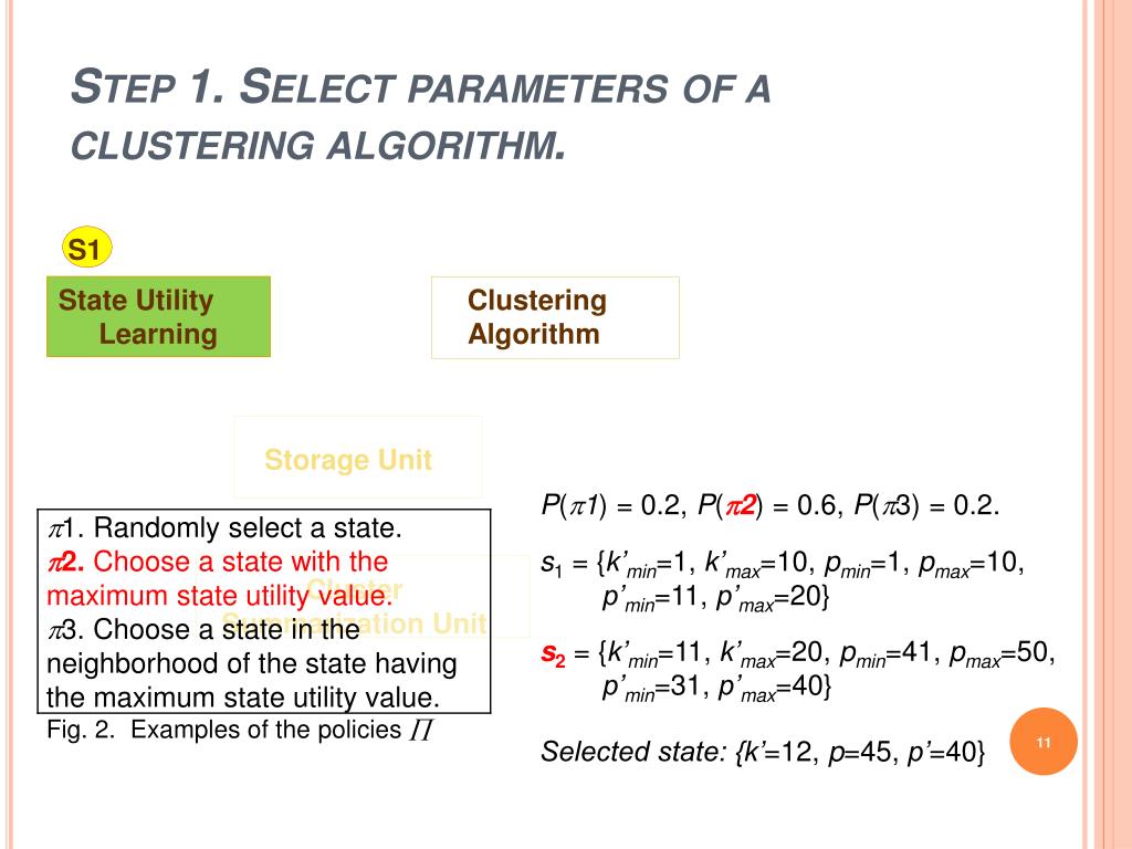Step 1. Select parameters of a clustering algorithm. S1 State Utility Learning Clustering Algorithm Storage Unit P(1) = 0.2, P(2) = 0.6, P(3) = 0.2. s1 = {k’min=1, k’max=10, pmin=1, pmax=10, p’min=11, p’max=20} Cluster Summarization Unit s2 = {k’min=11, k’max=20, pmin=41, pmax=50, p’min=31, p’max=40} Selected state: {k’=12, p=45, p’=40}