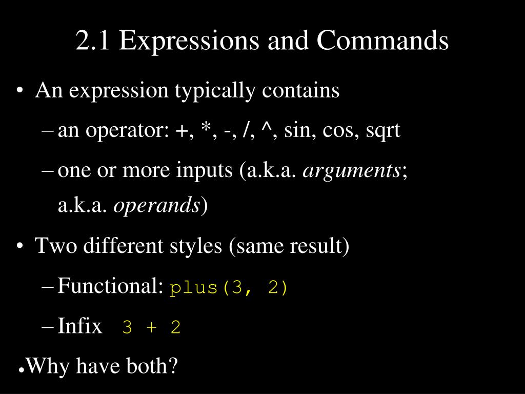 2.1 Expressions and Commands • An expression typically contains • an operator: +, *, -, /, ^, sin, cos, sqrt • one or more inputs (a.k.a. arguments; a.k.a. operands) • Two different styles (same result) • Functional:plus(3, 2) • Infix: 3 + 2 • Why have both?