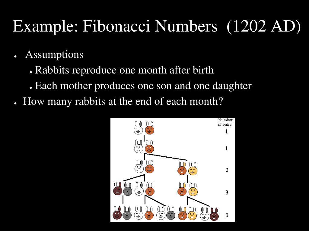 Example: Fibonacci Numbers (1202 AD) • Assumptions • Rabbits reproduce one month after birth • Each mother produces one son and one daughter • How many rabbits at the end of each month?
