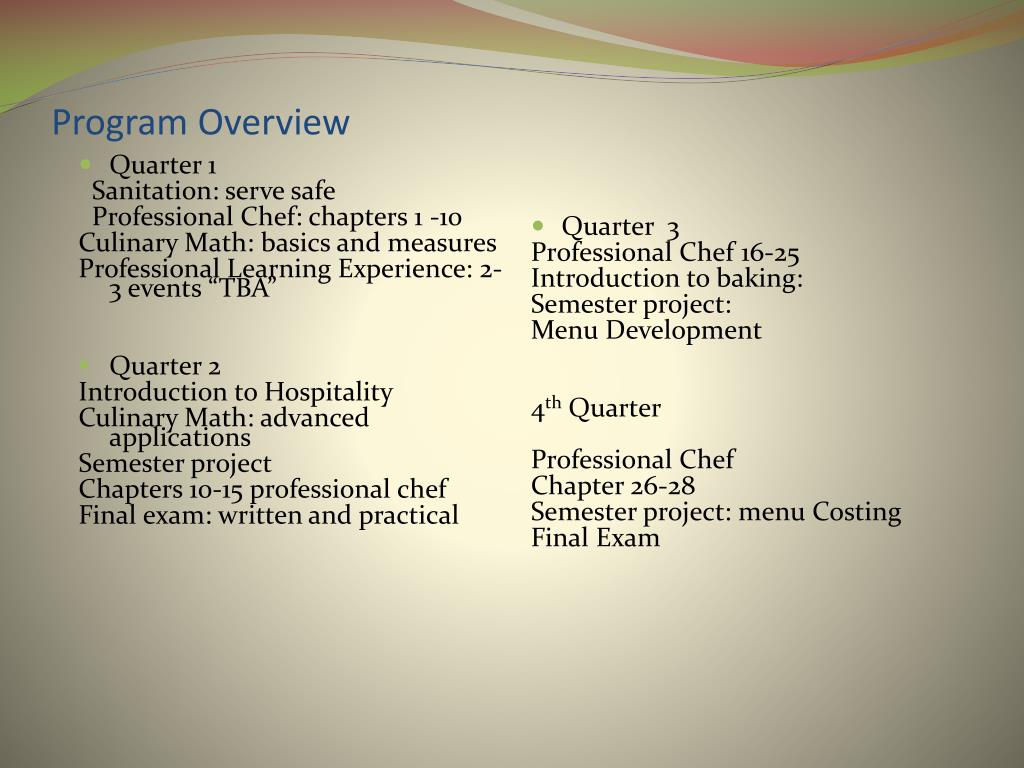Program Overview • Quarter 1 Sanitation: serve safe Professional Chef: chapters 1 -10 Culinary Math: basics and measures Professional Learning Experience: 2-3 events “TBA” • Quarter 2 Introduction to Hospitality Culinary Math: advanced applications Semester project Chapters 10-15 professional chef Final exam: written and practical • Quarter 3 Professional Chef 16-25 Introduction to baking: Semester project: Menu Development 4th Quarter Professional Chef Chapter 26-28 Semester project: menu Costing Final Exam