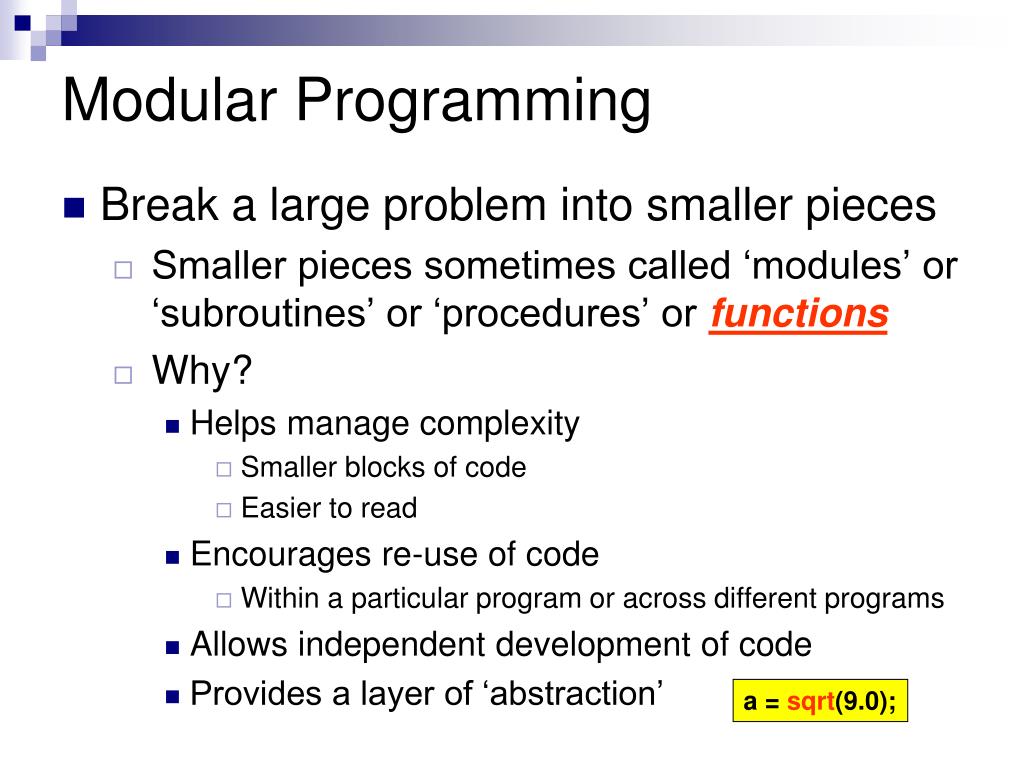 Break a large problem into smaller pieces Smaller pieces sometimes called ‘modules’ or ‘subroutines’ or ‘procedures’ or functions Why? Helps manage complexity Smaller blocks of code Easier to read Encourages re-use of code Within a particular program or across different programs Allows independent development of code Provides a layer of ‘abstraction’ Modular Programming a = sqrt(9.0);