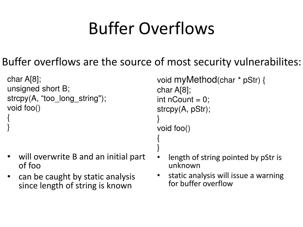 Buffer Overflows Bufferoverflowsarethesourceofmostsecurityvulnerabilites: char A[8]; unsignedshort B; strcpy(A, “too_long_string"); voidfoo() { } • will overwrite B and an initialpartoffoo • canbecaughtbystaticanalysissincelengthofstringisknown voidmyMethod(char * pStr) { char A[8]; intnCount = 0; strcpy(A, pStr); } voidfoo() { } • length of stringpointedbypStr is unknown • staticanalysiswillissue a warningfor bufferoverflow