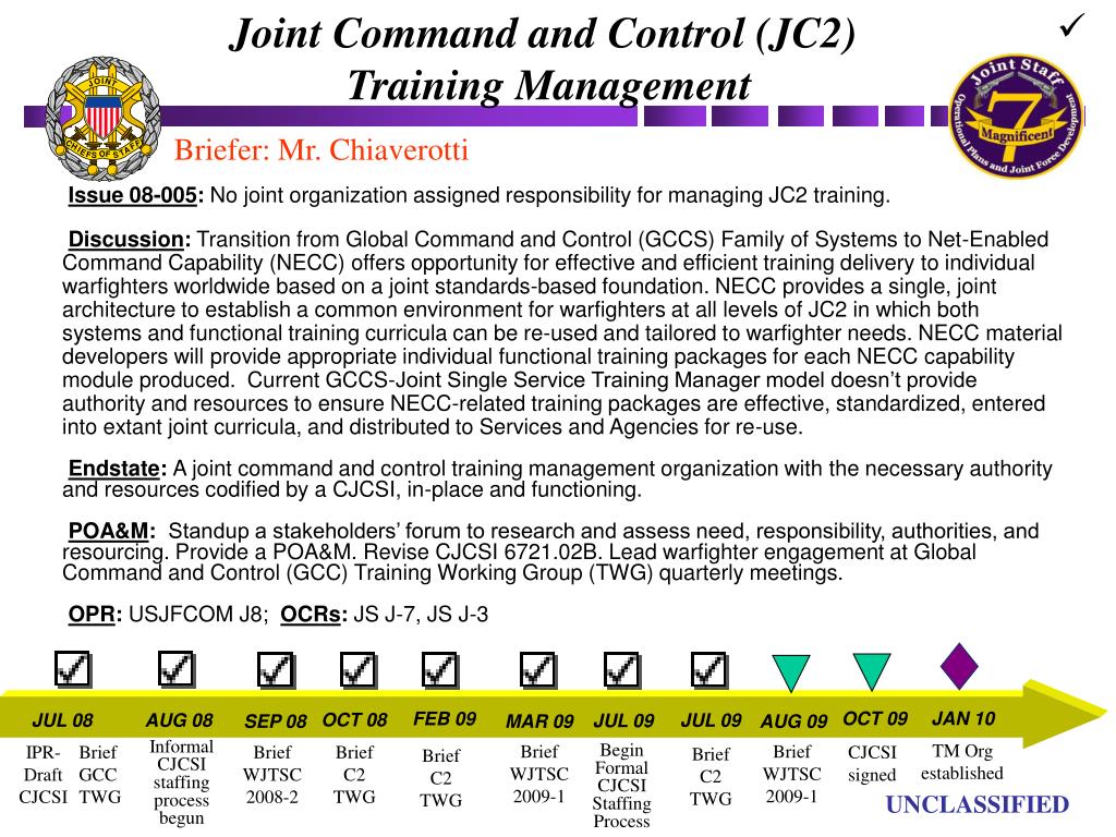 Joint Command and Control (JC2) Training Management OCT 09 JAN 10 FEB 09 OCT 08 JUL 08 AUG 08 JUL 09 JUL 09 SEP 08 MAR 09 AUG 09 Informal CJCSI staffing process begun TM Org established Brief WJTSC 2009-1 Brief WJTSC 2009-1 IPR-Draft CJCSI Brief GCC TWG Brief WJTSC 2008-2 Brief C2 TWG CJCSI signed Begin Formal CJCSI Staffing Process Brief C2 TWG Brief C2 TWG Briefer: Mr. Chiaverotti Issue 08-005: No joint organization assigned responsibility for managing JC2 training. Discussion: Transition from Global Command and Control (GCCS) Family of Systems to Net-Enabled Command Capability (NECC) offers opportunity for effective and efficient training delivery to individual warfighters worldwide based on a joint standards-based foundation. NECC provides a single, joint architecture to establish a common environment for warfighters at all levels of JC2 in which both systems and functional training curricula can be re-used and tailored to warfighter needs. NECC material developers will provide appropriate individual functional training packages for each NECC capability module produced. Current GCCS-Joint Single Service Training Manager model doesn’t provide authority and resources to ensure NECC-related training packages are effective, standardized, entered into extant joint curricula, and distributed to Services and Agencies for re-use. Endstate: A joint command and control training management organization with the necessary authority and resources codified by a CJCSI, in-place and functioning. POA&M: Standup a stakeholders’ forum to research and assess need, responsibility, authorities, and resourcing. Provide a POA&M. Revise CJCSI 6721.02B. Lead warfighter engagement at Global Command and Control (GCC) Training Working Group (TWG) quarterly meetings. OPR: USJFCOM J8; OCRs: JS J-7, JS J-3