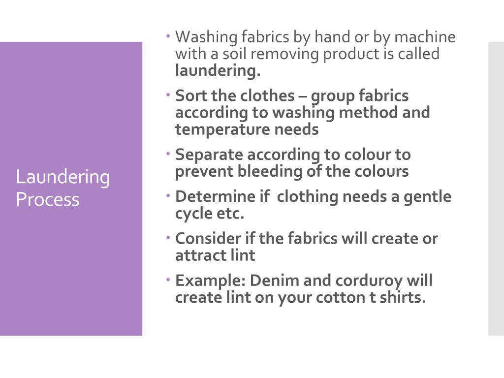 Washing fabrics by hand or by machine with a soil removing product is called laundering. • Sort the clothes – group fabrics according to washing method and temperature needs • Separate according to colour to prevent bleeding of the colours • Determine if clothing needs a gentle cycle etc. • Consider if the fabrics will create or attract lint • Example: Denim and corduroy will create lint on your cotton t shirts. Laundering Process