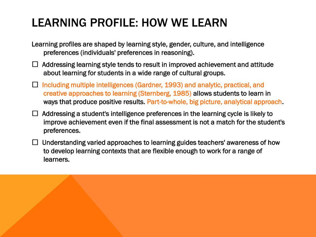 Learning Profile: How we learn • Learning profiles are shaped by learning style, gender, culture, and intelligence preferences (individuals' preferences in reasoning). • Addressing learning style tends to result in improved achievement and attitude about learning for students in a wide range of cultural groups. • Including multiple intelligences (Gardner, 1993) and analytic, practical, and creative approaches to learning (Sternberg, 1985) allows students to learn in ways that produce positive results. Part-to-whole, big picture, analytical approach. • Addressing a student's intelligence preferences in the learning cycle is likely to improve achievement even if the final assessment is not a match for the student's preferences. • Understanding varied approaches to learning guides teachers' awareness of how to develop learning contexts that are flexible enough to work for a range of learners.