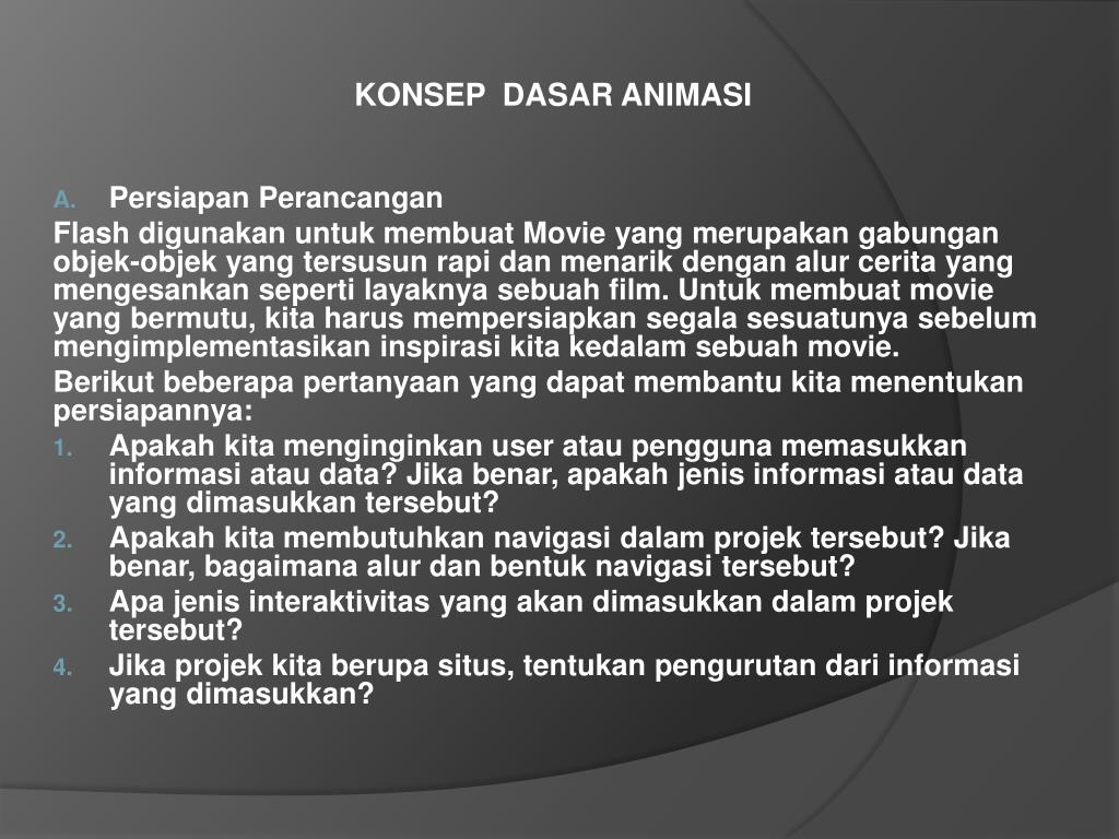 KONSEP DASAR ANIMASI Persiapan Perancangan Flash digunakan untuk membuat Movie yang merupakan gabungan objek-objek yang tersusun rapi dan menarik dengan alur cerita yang mengesankan seperti layaknya sebuah film. Untuk membuat movie yang bermutu, kita harus mempersiapkan segala sesuatunya sebelum mengimplementasikan inspirasi kita kedalam sebuah movie. Berikut beberapa pertanyaan yang dapat membantu kita menentukan persiapannya: Apakah kita menginginkan user atau pengguna memasukkan informasi atau data? Jika benar, apakah jenis informasi atau data yang dimasukkan tersebut? Apakah kita membutuhkan navigasi dalam projek tersebut? Jika benar, bagaimana alur dan bentuk navigasi tersebut? Apa jenis interaktivitas yang akan dimasukkan dalam projek tersebut? Jika projek kita berupa situs, tentukan pengurutan dari informasi yang dimasukkan?
