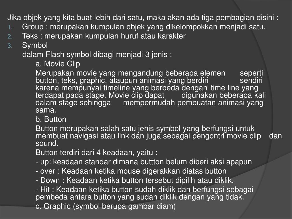 Jika objek yang kita buat lebih dari satu, maka akan ada tiga pembagian disini : • Group : merupakan kumpulan objek yang dikelompokkan menjadi satu. • Teks : merupakan kumpulan huruf atau karakter • Symbol dalam Flash symbol dibagi menjadi 3 jenis : a. Movie Clip Merupakan movie yang mengandung beberapa elemen seperti button, teks, graphic, ataupun animasi yang berdiri sendiri karena mempunyai timeline yang berbeda dengan time line yang terdapat pada stage. Movie clip dapat digunakan beberapa kali dalam stage sehingga mempermudah pembuatan animasi yang sama. b. Button Button merupakan salah satu jenis symbol yang berfungsi untuk membuat navigasi atau link dan juga sebagai pengontrl movie clip dan sound. Button terdiri dari 4 keadaan, yaitu : - up: keadaan standar dimana buttton belum diberi aksi apapun - over : Keadaan ketika mouse digerakkan diatas button - Down : Keadaan ketika button tersebut dipilih atau diklik. - Hit : Keadaan ketika button sudah diklik dan berfungsi sebagai pembeda antara button yang sudah diklik dengan yang tidak. c. Graphic (symbol berupa gambar diam)