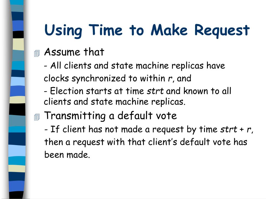 Using Time to Make Request • Assume that - All clients and state machine replicas have clocks synchronized to within r, and - Election starts at time strt and known to all clients and state machine replicas. • Transmitting a default vote - If client has not made a request by time strt + r, then a request with that client’s default vote has been made.